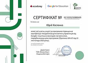 Відповідно до Листа МОН № 22/491-25 від 25.11.2025 р. «Про програму «Академія ШІ для освітніх управлінців» доцент кафедри обліку і оподаткування, гарант ОП «Облік і оподаткування» Костенко Юрій Олексійович взяв участь у курсі за програмою підвищення кваліфікації «Академія ШІ для освітніх управлінців від Google» та успішно оволодів вміннями, передбаченими цією програмою з 02.12.2025 по 11.12.2025 в обсязі 15 год/0,5 кр ЄКТС.