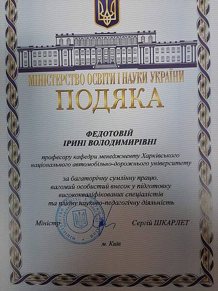 Колектив кафедри менеджменту щиро вітає професора кафедри, д.е.н. Федотову Ірину Володимирівну із врученням Подяки Міністерства освіти і науки України за багаторічну сумлінну працію, вагомий внесок у підготовку висококваліфікованих спеціалістів та плідну науково-педагогічну діяльність. Від всього серця бажаємо миру, натхнення, успіхів в роботі і особистому житті, подальших високих досягнень і міцного здоров'я!