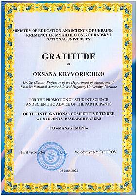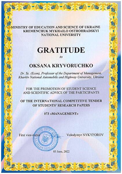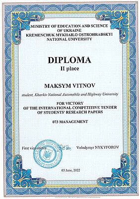 Кафедра менеджменту вітає студентів Вітнова Максима і Яна Цзиньхау та їх керівника проф. Криворучко Оксану Миколаївну з перемогою в Міжнародному конкурсі студентських науково-дослідних робіт.