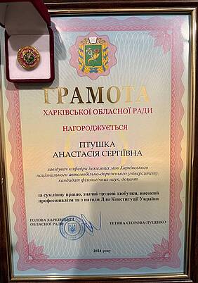 Завідувач кафедри іноземних мов Харківського національного автомобільно-дорожнього університету Птушка Анастасія Сергіївна отримала Грамоту від Харківської обласної ради за сумлінну працю, значні трудові здобутки, високий професіоналізм та з нагоди Дня Конституції України.