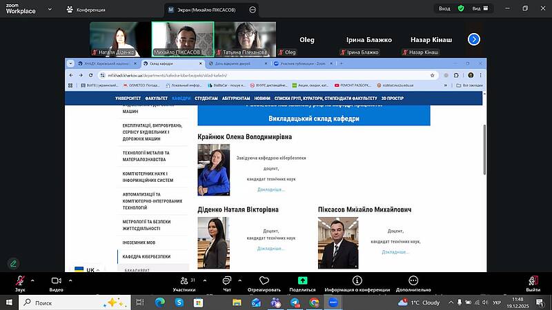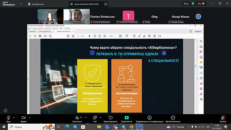 19 грудня 2025 року представники кафедри кібербезпеки доценти Наталя Вікторівна Діденко та Михайло Михайлович Піксасов разом зі здобувачами вищої освіти студентками групи МАК-11-25 Дар’єю Стрілець та Русланою Репринцевою презентували одну з найактуальніших освітніх програм — «Кібербезпека автоматизованих, мехатронних і робототехнічних систем» для учнів 11 класів ліцею №99 м. Харкова. Онлай-зустріч зібрала понад 30 абітурієнтів, які цікавляться світом інформаційних технологій і автоматизованих систем та їх захистом. У ході зустрічі були розглянуті та обговорені ключові напрямки підготовки за спеціальністю «Кібербезпека автоматизованих, мехатронних і робототехнічних систем», переваги навчання у ХНАДУ порівняно з іншими ЗВО, перспективи працевлаштування та питання з НМТ. Захід проходив у дружній, але водночас змістовній атмосфері. Було приємно бачити щирий інтерес молоді до складних технічних тем та бажання глибше зрозуміти світ ІТ. Ми дякуємо ліцеїстам за активну участь і запрошуємо приєднуватися до нашої університетської спільноти!