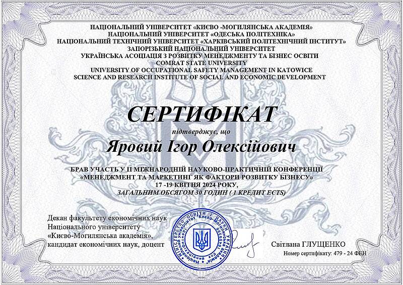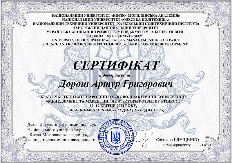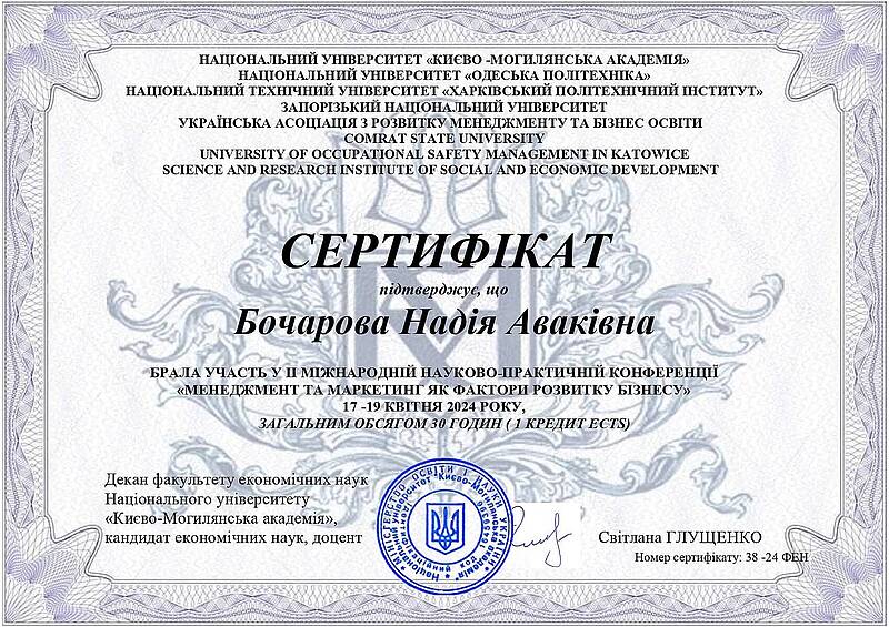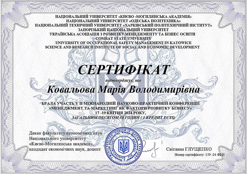 17-19 квітня 2024 року аспірант Ігор Яровий (наук. керівник доц. Надія Бочарова), здобувачі рівня молодший бакалавр Карина Полапа (наук. керівник доц. Надія Бочарова), бакалавр Артур Дорош, Валерія Самойлова (наук. керівник доц. Надія Бочарова), Марія Ковальова, Анастасія Резніченко (наук. керівник доц. Андрій Близнюк) й магістр Катерина Даниленко (наук. керівник доц. Надія Бочарова) та викладачі проф. Надія Попова, доц. Андрій Близнюк, доц. Надія Бочарова кафедри менеджменту Харківського національного автомобільно-дорожнього університету взяли активну участь у ІІ Міжнародній науково-практичній конференції «Менеджмент та маркетинг як фактори розвитку бізнесу», що проводилася Національним університетом «Києво-Могилянська Академія». Ця значуща подія зібрала видатних науковців та практиків з різних країн, аби обговорити актуальні питання та виклики, які стоять перед сучасним бізнесом.