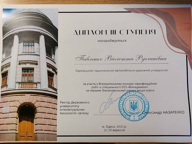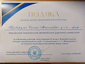 ІІІ місце (бакалаврський рівень, 1-й рівень вищої освіти) — Віолета Павленко, спеціальність 073 «Менеджмент». Науковий керівник — проф. Оксана Криворучко.