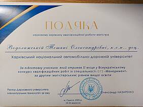 ІІ місце (магістерський рівень, 2-й рівень вищої освіти) — Тетяна Семенова, спеціальність 073 «Менеджмент». Науковий керівник — доц. Тетяна Водолажська.