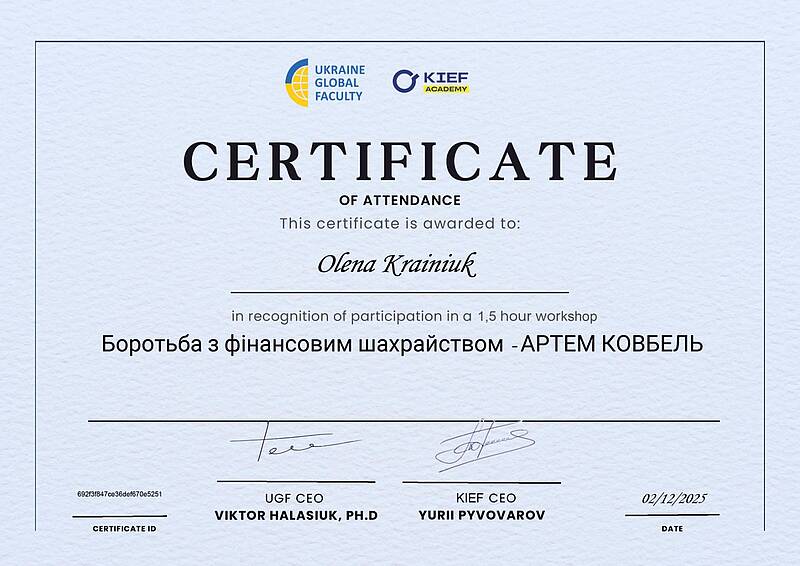 Питання економічної безпеки та розслідування фінансових зловживань стають дедалі актуальнішими в контексті сучасної кібербезпеки. Викладачі кафедри кібербезпеки продовжують поглиблювати свою експертизу в цих напрямках. 2 грудня 2025 року завідувачка кафедри Олена Крайнюк взяла участь у спеціалізованому семінарі «Боротьба з фінансовим шахрайством», організованому освітньою платформою Ukraine Global Faculty. Спікером заходу виступив Артем Ковбель — сертифікований аудитор, співвласник компанії Crowe Erfolg та визнаний експерт у сфері форензік. Учасники семінару детально розглянули такі ключові теми: • Основні ризики корпоративного шахрайства: аналіз загроз, з якими стикається сучасний бізнес; • Ознаки та методи протидії: як своєчасно виявити підозрілу активність та побудувати ефективну систему захисту; • Практичні кейси (форензік): розбір реальних ситуацій боротьби з фінансовими махінаціями. Здобуті знання допоможуть актуалізувати навчальні матеріали дисциплін кафедри, додавши до них практичні аспекти корпоративної безпеки та фінансових розслідувань.