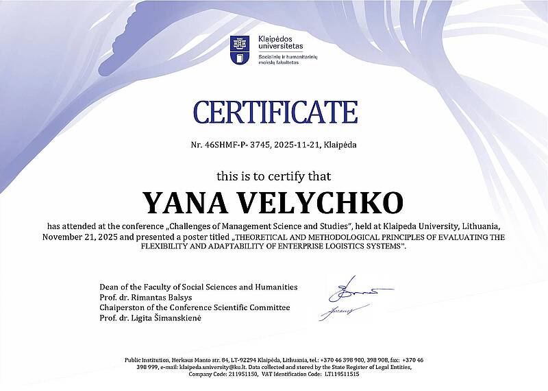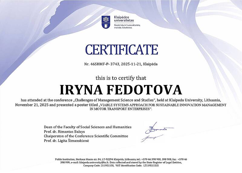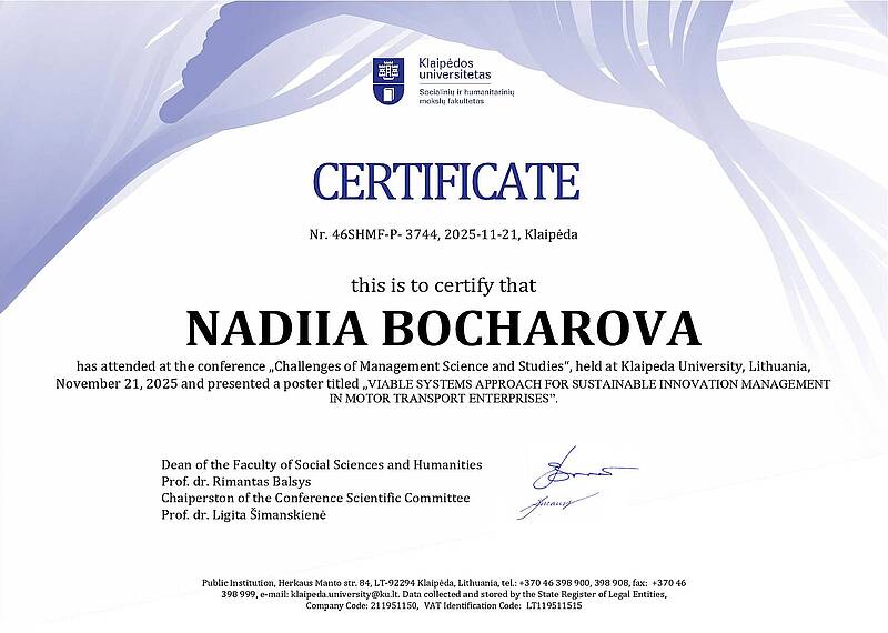 У межах розвитку міжнародного співробітництва викладачі кафедри менеджменту – професорка Ірина Федотова, доцентка Надія Бочарова та старша викладачка Яна Величко – представили університет на міжнародній науковій конференції „Challenges of Management Science and Studies“, що відбулася 21 листопада 2025 року на базі Університету Клайпеди (Klaipeda University), Литва.