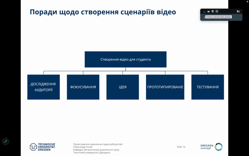 Тренер Олександр Колій з кафедри автоматизації дорожнього руху Технічного університета Дрездена провів перші два теоретичних та практичних модулі на теми Вступ до цифрових лабораторій та Проектування навчальної відеолабораторії