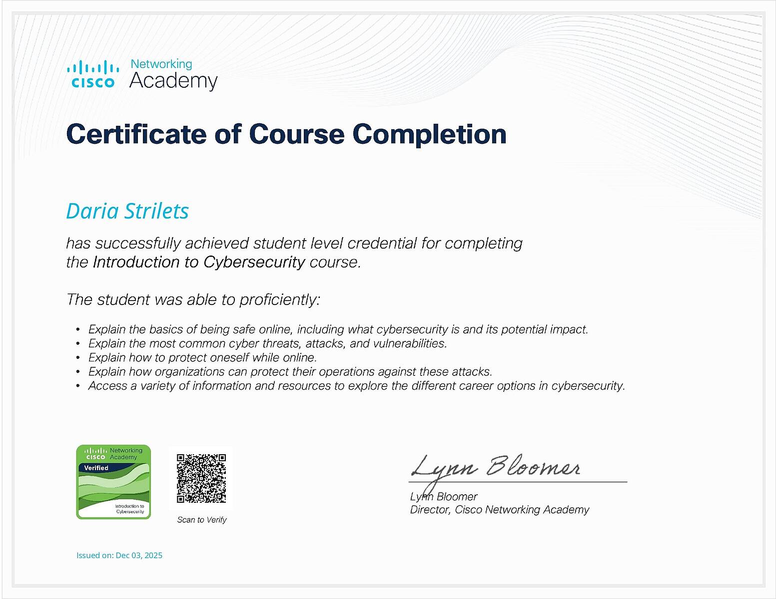 Published: 12/04/2025 Вдалий старт у професії: першокурсниця кафедри кібербезпеки здобула міжнародну сертифікацію Cisco Networking Academy 3 грудня 2025 року скарбничка досягнень здобувачів освіти кафедри кібербезпеки поповнилася важливою відзнакою. Студентка 1-го курсу Дар'я Стрілець успішно завершила навчання та отримала сертифікат курсу «Introduction to Cybersecurity» від академії Ci... Читати далі