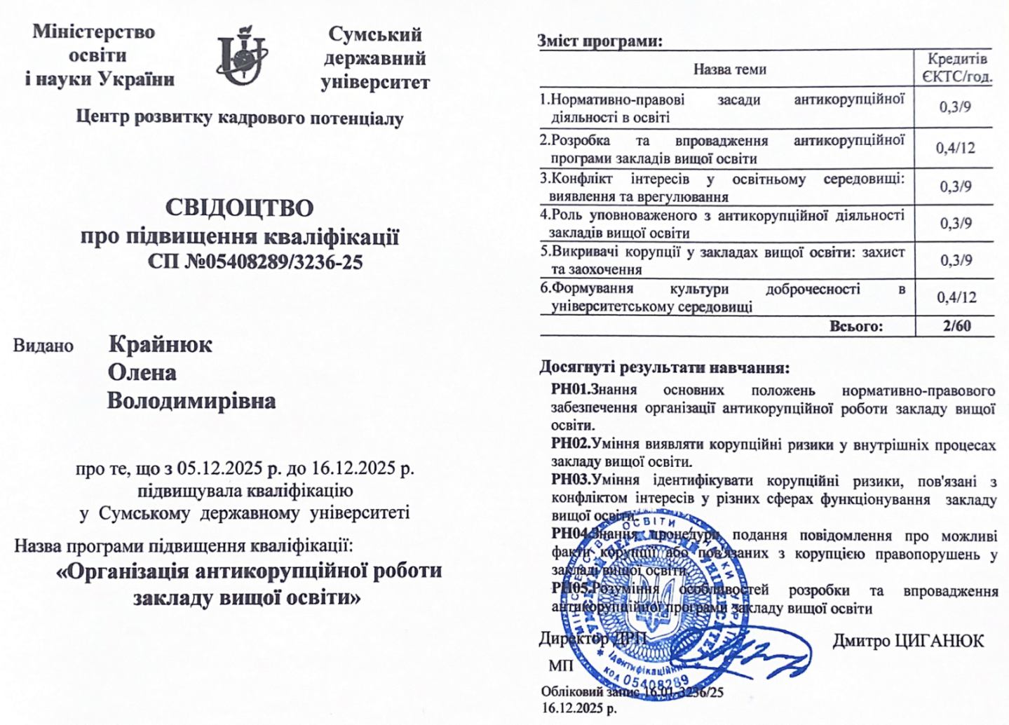 З 16 по 18 грудня 2025 року Михайло Піксасов успішно пройшов курс підвищення кваліфікації на тему «Професійний розвиток педагога в умовах освітніх трансформацій». Навчальна програма тривалістю 30 годин (1 кредит ЄКТС) була зосереджена на впровадженні...