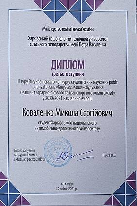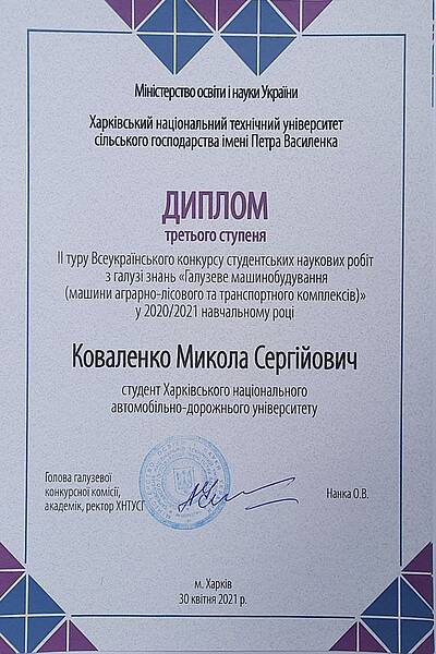 Студент Коваленко Микола Сергійович отримав ДИПЛОМ третього ступеня ІІ туру Всеукраїнського конкурсу студентських наукових робіт у галузі знань «Галузеве машинобудування (машини аграрно-ліcового і транспортного комплексів)» та його керівника Холодова Антона Павловича. Кафедра будівельних і дорожніх машин пишається такими студентами та співробітниками!