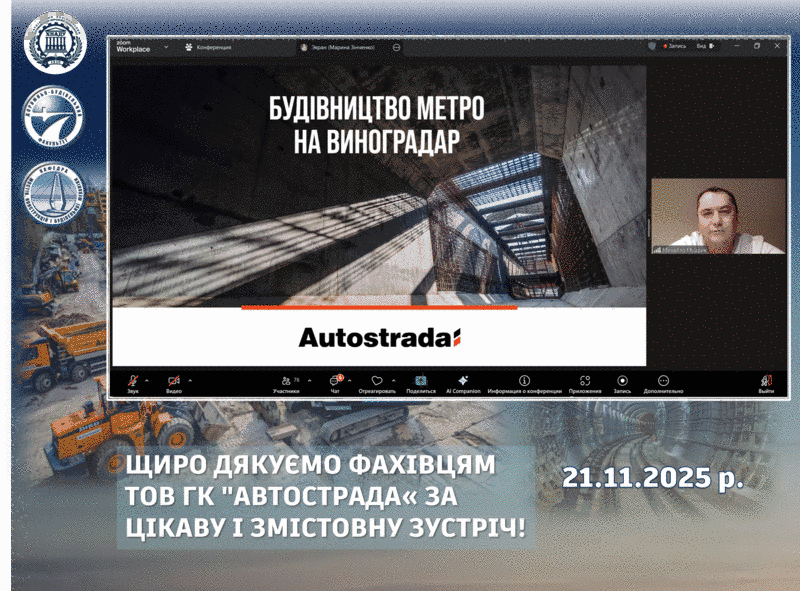 21 листопада 2025 р. на базі кафедри Мостів, конструкцій і будівельної механіки ім. В.О. Російського у форматі Zoom-зустрічі відбулася гостьова лекція від фахівців ТОВ ГК «АВТОСТРАДА», яка об'єднала фахівців-практиків, викладачів та здобувачів освіти дорожньо-будівельного факультету ХНАДУ спеціальностей G19 Будівництво та цивільна інженерія, G18 Геодезія та землеустрій, G1 Хімічні технології та інженерія, а також представників Харківського автомобільно-дорожнього фахового коледжу, ВСП Класичний фаховий коледж СумДУ та ВСП Конотопський індустріально-педагогічний фаховий коледж СумДУ.