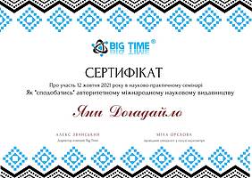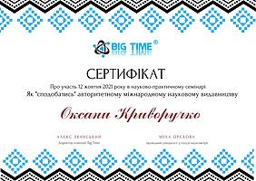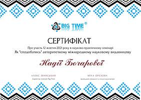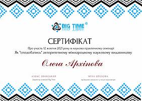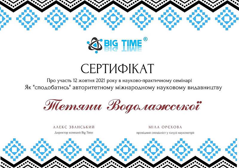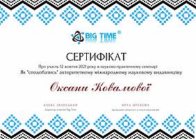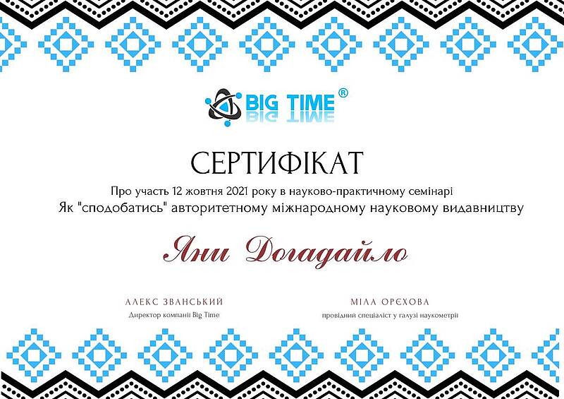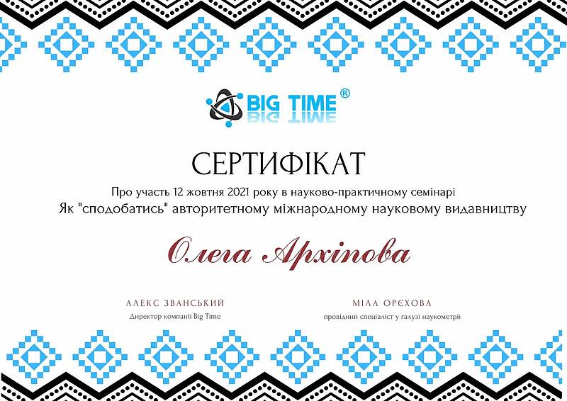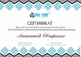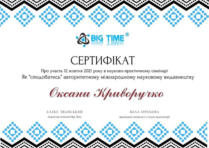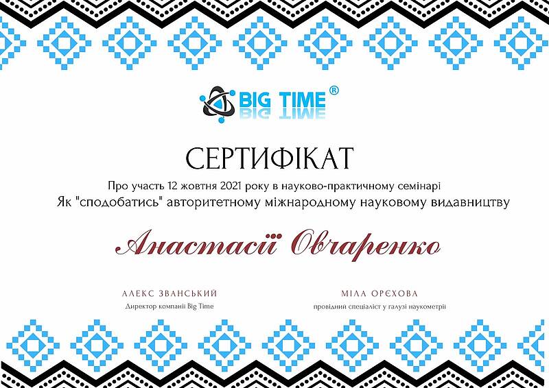 12 жовтня 2021 року виклаладачі кафедри менеджменту проф. Криворучко О.М., проф. Федотова В.В., доц. Догадайло Я.В., доц. Бочарова Н.А., доц. Водолажська Т.О., а також аспіранти кафедри Архіпов О.В., Мезенцова А.В., Ковальова О.П., Овчаренко П.В. прийняли участь у вебінарі від компанії Big Time, яка провела онлайн семінар на тему: "Як успішно опублікувати статтю в міжнародному журналі і підвищити рейтинг ВНЗ" з метою підвищення публікаційній етики та усвідомленості.