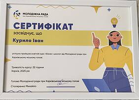 20 червня здобувач завершив навчання на «Бізнес-Школі» від Молодіжної ради при Харківському міському голові, що дозволило поглибити розуміння підприємницьких практик і сучасних управлінських інструментів.