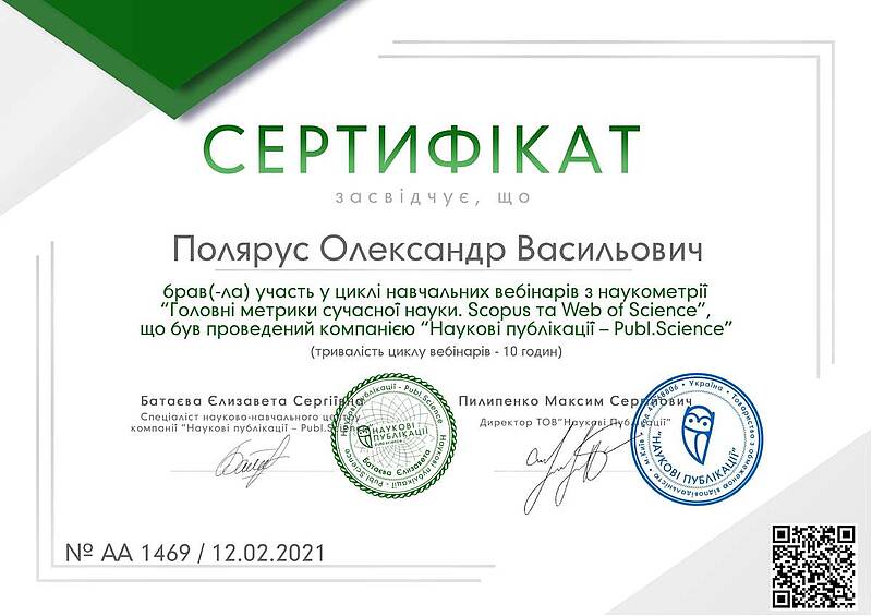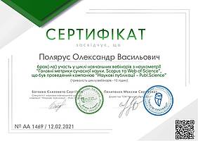 Завідувач кафедри метрології та БЖД, д.т.н., проф. Полярус О.В. пройшов цикл навчальних вебінарів з наукометрних "Головні метрники сучасної науки. Scopus та Web of Science', що були проведені компанією "Наукові публікації - Publ.Science".