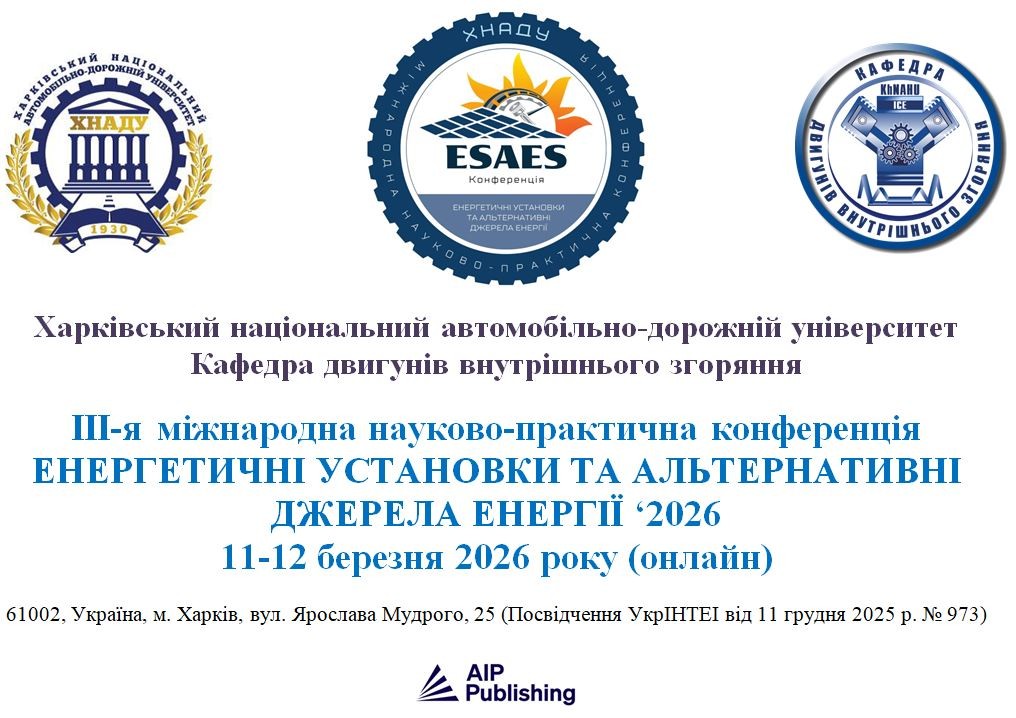 Кафедра двигунів внутрішнього згоряння Харківського національного автомобільно-дорожнього університету запрошує взяти участь вчених, інженерів, фахівців, експертів, бізнесменів, аспірантів та студентів у роботі III-ї Міжнародної науково-практичної конференції «ЕНЕРГЕТИЧНІ УСТАНОВКИ ТА АЛЬТЕРНАТИВНІ ДЖЕРЕЛА ЕНЕРГІЇ», яка відбудеться 11 та 12 березня 2026 року дистанційно (онлайн) на базі платформи ZOOM.