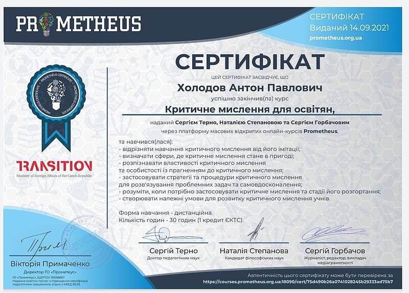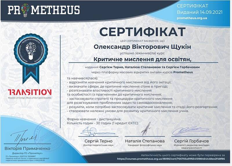 Викладачі кафедри БДМ, продовжють вдосконалення своїх педагогічних навиків та розвивати нестандартне мислення. Доцент Щукін Олександр Вікторович та доцент Холодов Антон Павлович успішно закінчили курс Критичне мислення для освітян, наданий Сергієм Терно, Наталією Степановою та Сергіем Горбачовим через платформу масових відкритих онлайн-курсів Prometheus, та навчилися: