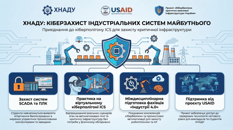 Кафедра кібербезпеки ХНАДУ посилює практичну підготовку на міждисциплінарній освітній програмі «Кібербезпека автоматизованих, мехатронних і робототехнічних систем». Завдяки участі у Проєкті «Кібербезпека критично важливої інфраструктури України», наші студенти та викладачі отримали доступ до інноваційного кіберполігона ICS, створеного за підтримки Уряду США (USAID) та компанії OptiData.