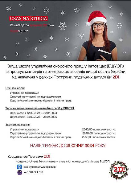 Маємо честь повідомити, що розпочато набір студентів магістратури спеціальності 073 "Менеджмент" до участі у Програмі Два дипломи (ОС магістр) на 2023-2024 академічний рік у Вищій школі управління охороною праці у Катовіцах.