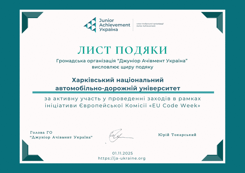 ХНАДУ взяв участь у Європейському тижні кодування (EU Code Week 2025), міжнародній ініціативі, що популяризує програмування та цифрову грамотність. Цьогорічна ініціатива, яку в Україні координує Junior Achievement Ukraine (JA Ukraine) за підтримки МОН, об'єднала мільйони однодумців із понад 40 країн Європи.