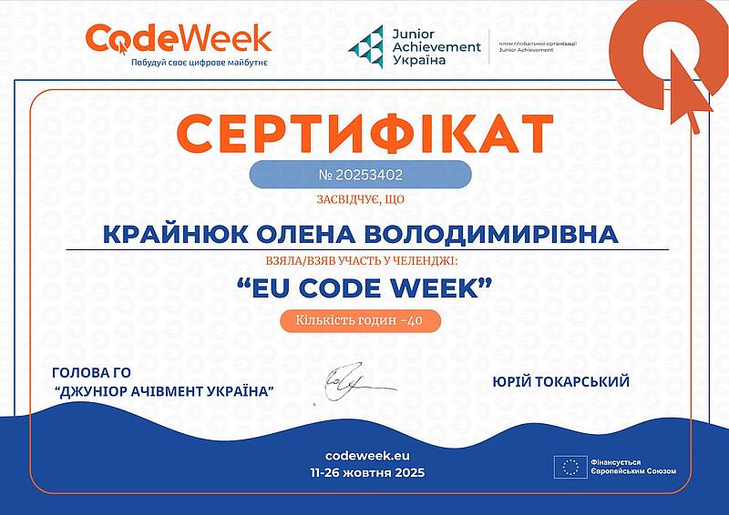 Участь у EU Code Week 2025 сприяла потужному розвитку алгоритмічного мислення та цифрової грамотності наших студентів, готуючи їх до сучасного технологічного середовища. Найбільш активні студенти групи МАК-11-25 Яковлева Анастасія, Філей Анастасія, Малишкін Кирил отримали сертифікати учасників.