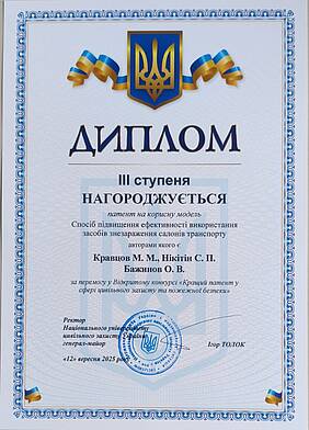 Дипломом ІІІ ступеня був нагороджений доцент кафедри метрології та безпеки життєдіяльності Кравцов М.М. разом зі співавторами Нікітіним С.П. та Бажиновим О.В. за перемогу у Відкритому конкурсі "Кращий патент у сфері цивільного захисту та пожежної безпеки" від 12 вересня 2025 року на базі Національного університету цивільного захисту України (м. Черкаси).