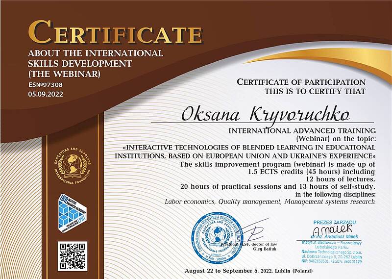 В період з 22 серпня по 5 вересня проводилось міжнародне підвищення кваліфікації для освітян на тему "Інтерактивні технології змішаного навчання в закладах освіти: досвід країн Європейського союзу та України" в якому прийняла участь завідувачка кафедри, професор Криворучко О.М.. Організатором цього заходу є Науково-дослідний інститут Люблінського технологічногопарку та IESF Міжнародна фундація науковців та освітян.