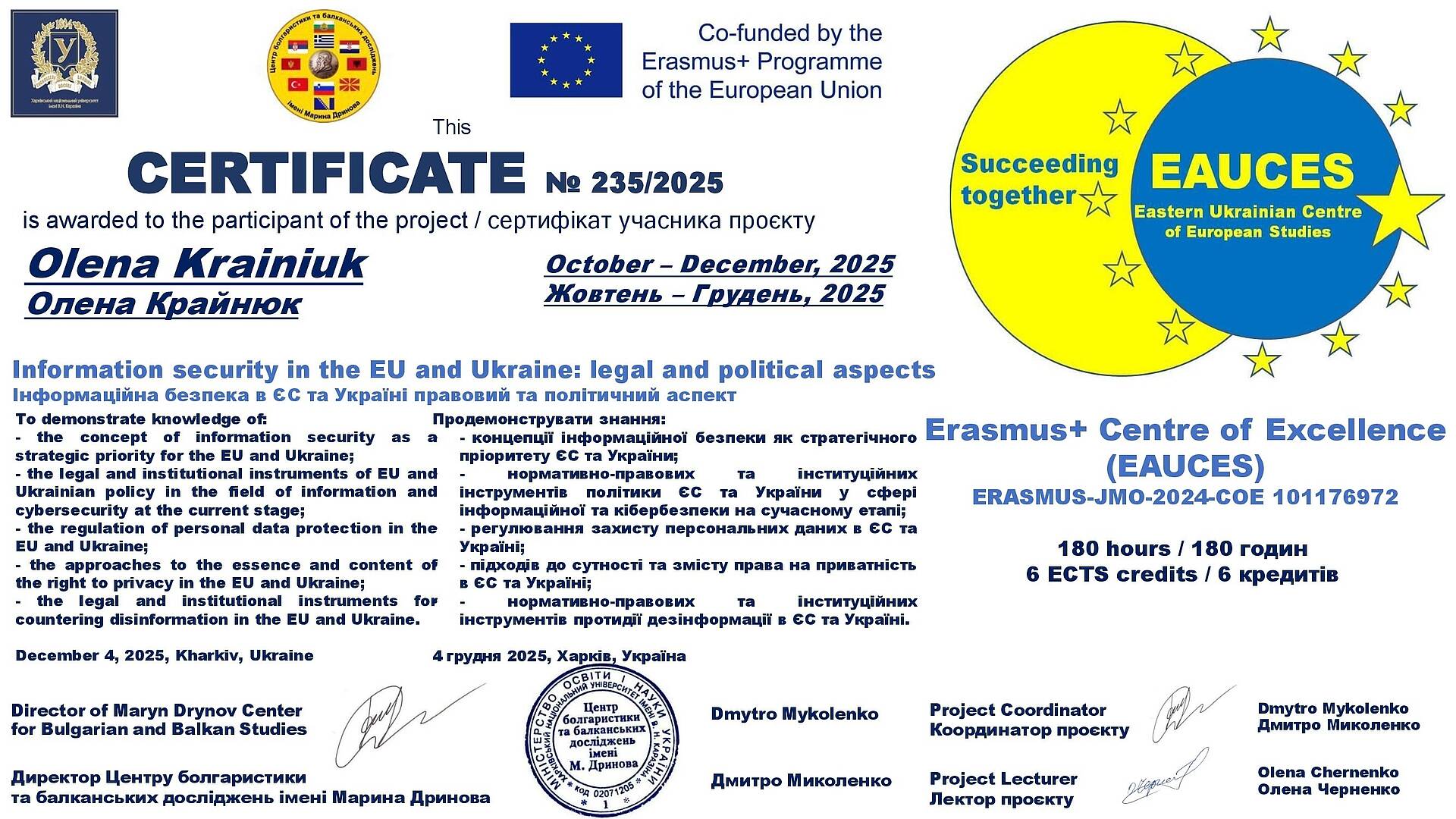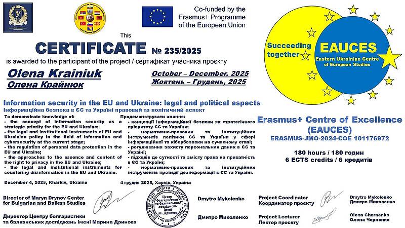 Навчання проходило у період з жовтня по грудень 2025 року. Олена Крайнюк стала учасницею спеціалізованого проєкту «Інформаційна безпека в ЄС та Україні: правовий та політичний аспект» (Information security in the EU and Ukraine: legal and political aspects).