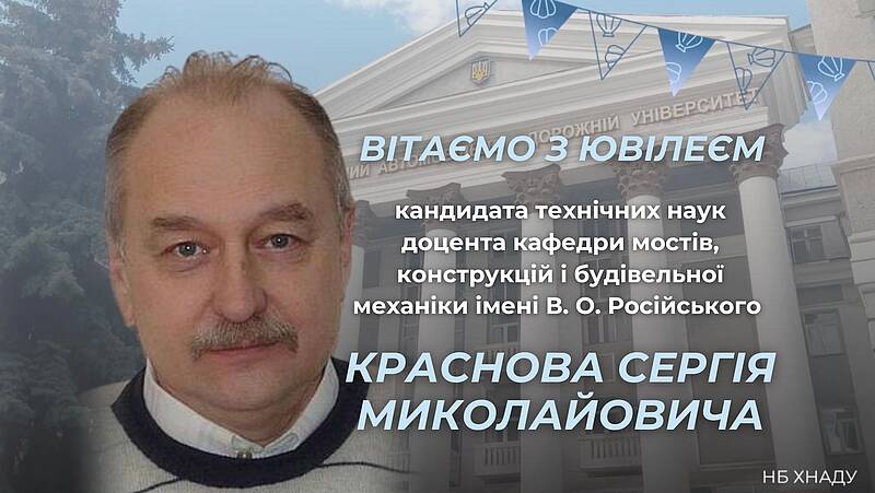 З нагоди ювілею кандидата технічних наук, доцента кафедри мостів, конструкцій і будівельної механіки імені В. О. Російського Сергія Миколайовича Краснова Наукова бібліотека підготувала віртуальну виставку його наукових та навчально-методичних праць. Віртуальна експозиція презентує наукові публікації, що відображають широту професійних інтересів ученого, актуальність його досліджень і значущість результатів для освітнього процесу університету.
