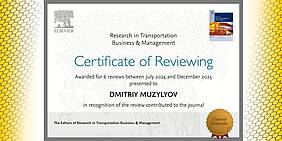Кафедра «Транспортних технологій» Харківського національного автомобільно-дорожнього університету (ХНАДУ) в межах міжнародної діяльності та роботи факультету транспортних систем інформує про професійне визнання наукової експертизи нашого співробітника. Доцент кафедри Дмитро Mузильов отримав сертифікат ELSEVIER Certificate of Reviewing від журналу Research in Transportation Business & Management за виконання 6 рецензій у період з липня 2024 до грудня 2025 року. Даний Журнал індексується в авторитетних наукометричних базах SCOPUS та Web of Science Core Collection (зокрема, Social Sciences Citation Index, SSCI), що підкреслює високі вимоги до якості рецензування та відбору публікацій у виданнях ELSEVIER рівня Q1-Q2.
