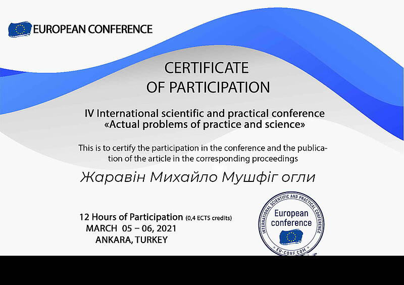 Магістр Жаравін Михайло Мушфіг огли (гр. МА-51-20) дистанційно прийняв участь у IV International Science Conference «Actual problems of practice and science» яка проходила з 05 по 06 березня 2021 у місті Анкара, Турція.