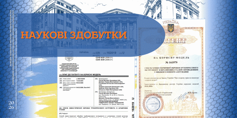 Кафедра технології металів і матеріалознавства імені О. М. Петриченка продовжує демонструвати високу наукову активність. На початку 2026 року було офіційно опубліковано два патенти на корисні моделі, співавтором яких є доктор технічних наук, професор Столбовий В'ячеслав Олександрович.