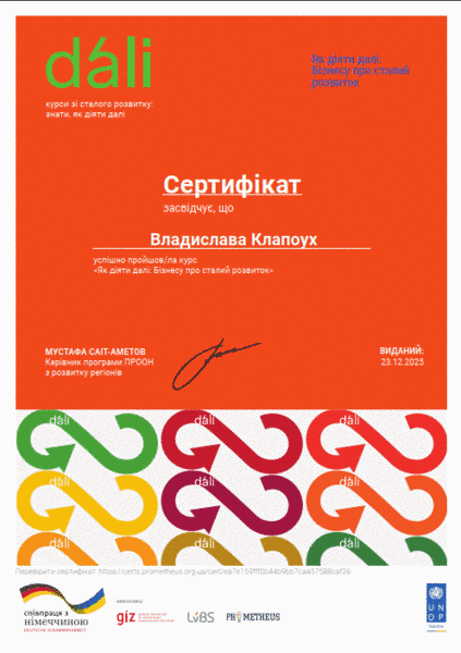 Клапоух Владислава успішно завершила курс «Як діяти далі: бізнесу про сталий розвиток», спрямований на формування системного розуміння концепції сталого розвитку, ролі бізнесу в досягненні Цілей сталого розвитку ООН, а також інтеграції принципів сталості в управлінські та бізнес-процеси. За результатами навчання здобувачка отримала сертифікат, що підтверджує опанування відповідного обсягу навчального матеріалу в межах неформальної освіти.