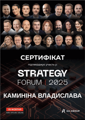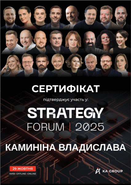 За результатами участі у форумі Камінін Владислав отримав іменний сертифікат, що підтверджує його залучення до професійного середовища та практикоорієнтоване опанування сучасних підходів до стратегічного управління.