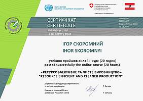 Здобувач вищої освіти Ігор Скоромний, студент бакалаврського рівня за освітньою програмою «Підприємництво, торгівля та біржова діяльність», успішно завершив онлайн-курс «Ресурсоефективне та чисте виробництво», розроблений Центром ресурсоефективного та чистого виробництва в рамках проєкту Організації Об’єднаних Націй з промислового розвитку (UNIDO) за підтримки Швейцарії. Участь студента підтверджено сертифікатом, що засвідчує здобуття практичних знань з управління екологічною ефективністю, оптимізації виробничих процесів і впровадження сталих бізнес-практик.