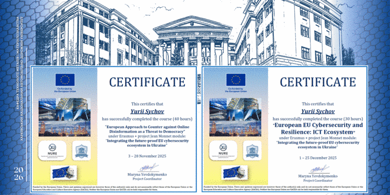 - Кібербезпека та стійкість: Курс «European EU Cybersecurity and Resilience: ICT Ecosystem» (обсягом 30 годин), що фокусувався на екосистемі ІКТ та стійкості кібербезпеки в ЄС. Навчання тривало з 1 по 25 грудня 2025 року.
