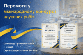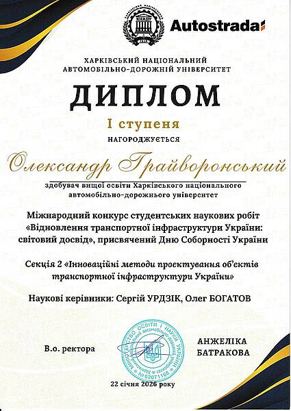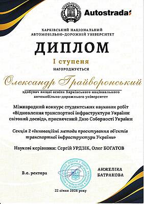 Студент Олександр Грайворонський нагороджений дипломом І ступеня за перемогу в Міжнародному конкурсі студентських наукових робіт «Відновлення транспортної інфраструктури України: світовий досвід», присвяченому Дню Соборності України. Робота була представлена у секції 2 «Інноваційні методи проєктування об’єктів транспортної інфраструктури України». Наукові керівники — Сергій Урдзік та Олег Богатов.