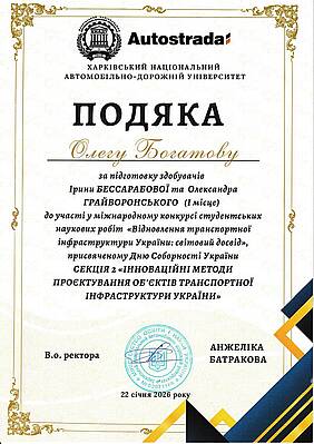 Окремо відзначено внесок завідувача кафедри Олега Богатова, якому висловлено подяку за підготовку здобувачів Ірини Бессарабової та Олександра Грайворонського, зокрема за результат І місце у зазначеному конкурсі. Подяку вручено 22 січня 2026 року від імені в.о. ректора Анжеліки Батракової.