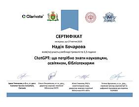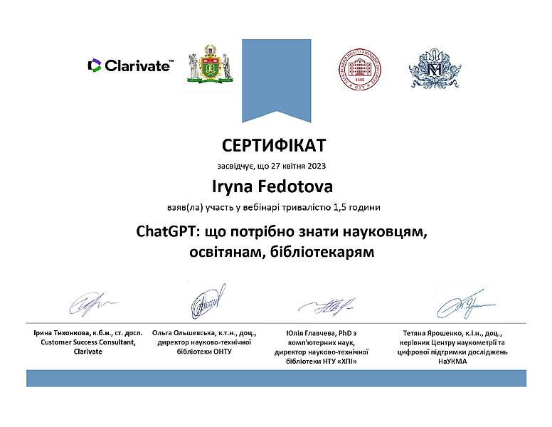 Другий вебінар в рамках All Digital Weeks 2023 був організований Національним університетом «Києво-Могилянська академія», Одеським національним технологічним університетом, Національним технічним університетом «Харківський політехнічний інститут» та "Clarivate". Тема вебінару була "ChatGPT: що потрібно знати науковцям, освітянам, бібліотекарям?" та на ньому було представлено кілька спікерів з досвідом у сфері штучного інтелекту та наукометрії. Учасники мали змогу дізнатися більше про роль та можливості штучного інтелекту в науковій роботі, про використання ChatGPT у бібліотечній справі та про очікування та реалії згідно аналізу літератури у Web of Science.