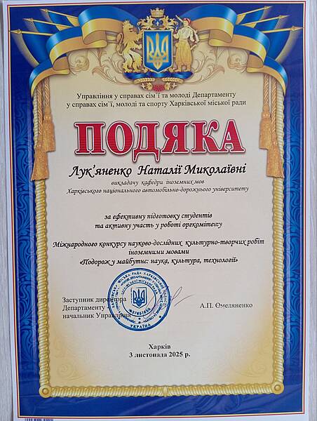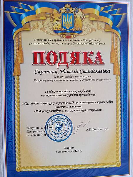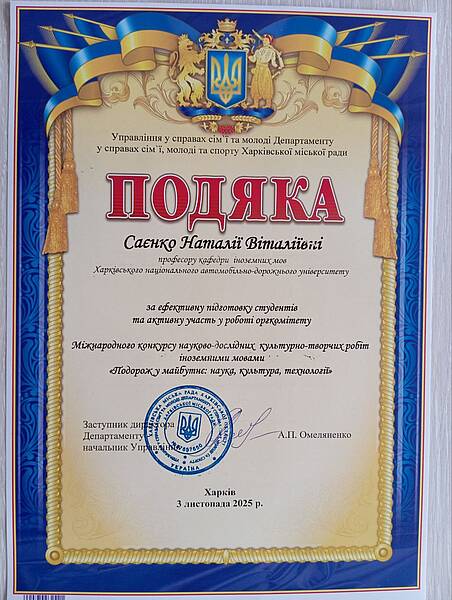 Викладачі кафедри іноземних мов Харківського національного автомобільно-дорожнього університету завідувачка кафедри, доцент Птушка Анастасія Сергіївна, професор Саєнко Наталія Віталіївна, доцент Скрипник Наталія Станіславівна та викладач Лук'яненко Наталія Миколаївна отримали Подяки від Управління у справах сім’ї та молоді Департаменту у справах сім’ї, молоді та спорту Харківської міської ради.