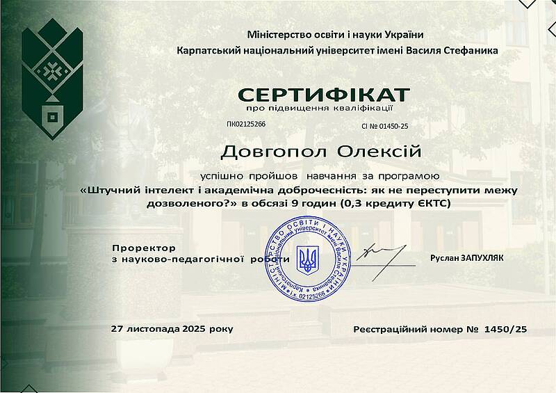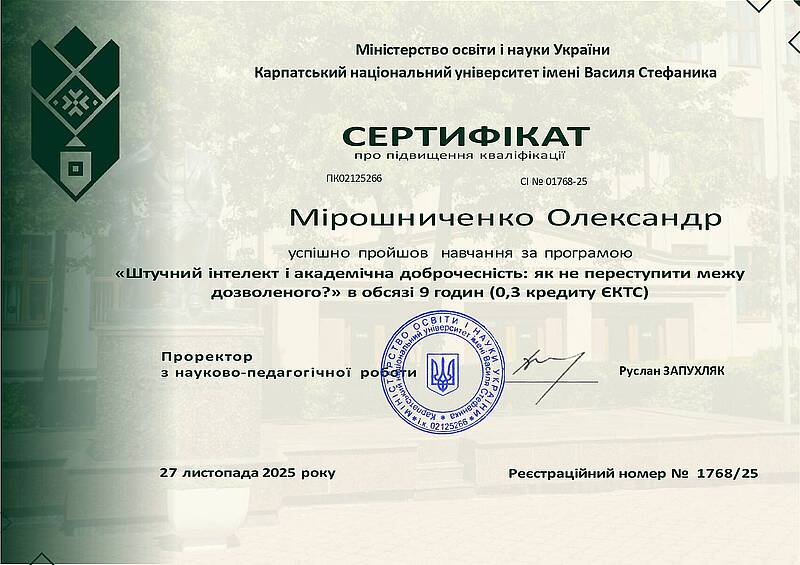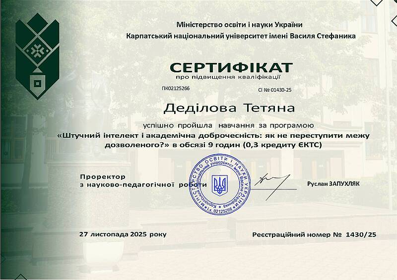 4 листопада 2025 року на базі Карпатського національного університету імені Василя Стефаника відбувся фаховий тренінг «Штучний інтелект і академічна доброчесність: як не переступити межу дозволеного?», організований Комісією з питань етики та академічної доброчесності університету. У заході взяли участь представники провідних ЗВО України, серед них – делегація кафедри економіки і підприємництва Харківського національного автомобільно-дорожнього університету у складі: