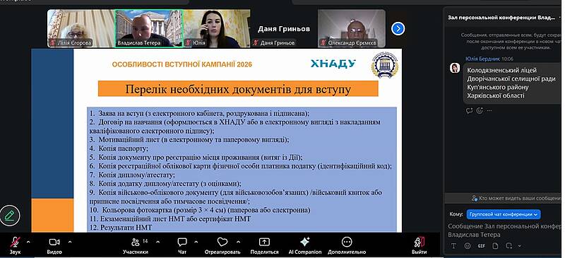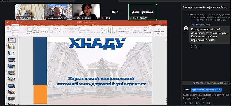 22.12.2025 відповідальною за профорієнтаційну роботу кафедри хімії та хімічної технології доц. Єгоровою Л.М. проведено захід «День відкритих дверей», на якому був присутній заступник декана Тетера В.С., який ознайомив присутніх на заході з інформацією про університет, зокрема, з дорожньо-будівельним факультетом і відповів на запитання учнів про вступну кампанію 2025 року. Доц. Єгорова презентувала інформацію про кафедру хімії та хімічної технології ХНАДУ. На заході були присутні учні випускних класів Куп'янського району в Харківській області, вчителі, директор Двурічанського ліцею, завідувачка районним відділом освіти Ждановська Т.В.