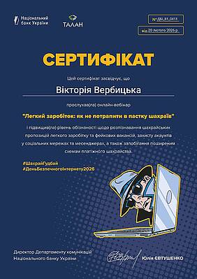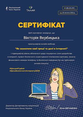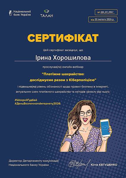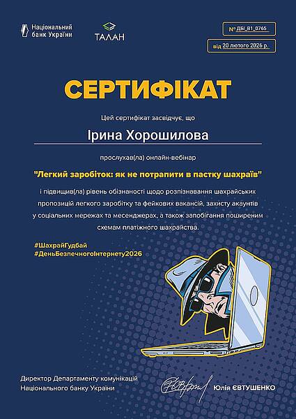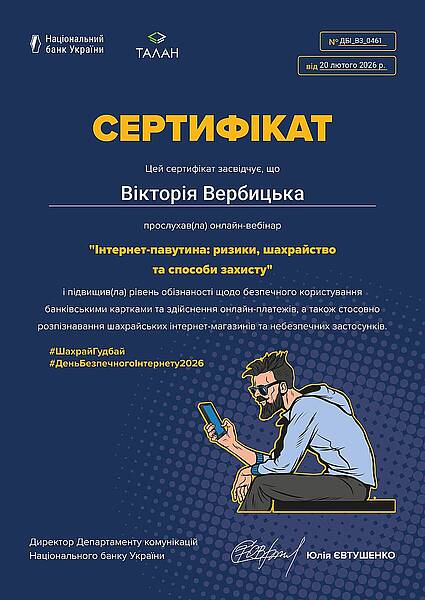 У період з 9 по 13 лютого 2026 року викладачі кафедри обліку і оподаткування доценти Вербицька В.І та Хорошилова І.О. взяли участь у серії просвітницьких вебінарів, організованих Національним банком України спільно з Департаментом кіберполіції Національної поліції України, КРЕДОБАНКом, ПриватБанком та Райффайзен Банком. якими проводилась інформаційна кампанія з підвищення фінансової грамотності та кібербезпеки населення. Програма заходів була присвячена актуальним питанням протидії платіжному шахрайству, захисту персональних даних та безпечному користуванню цифровими сервісами.