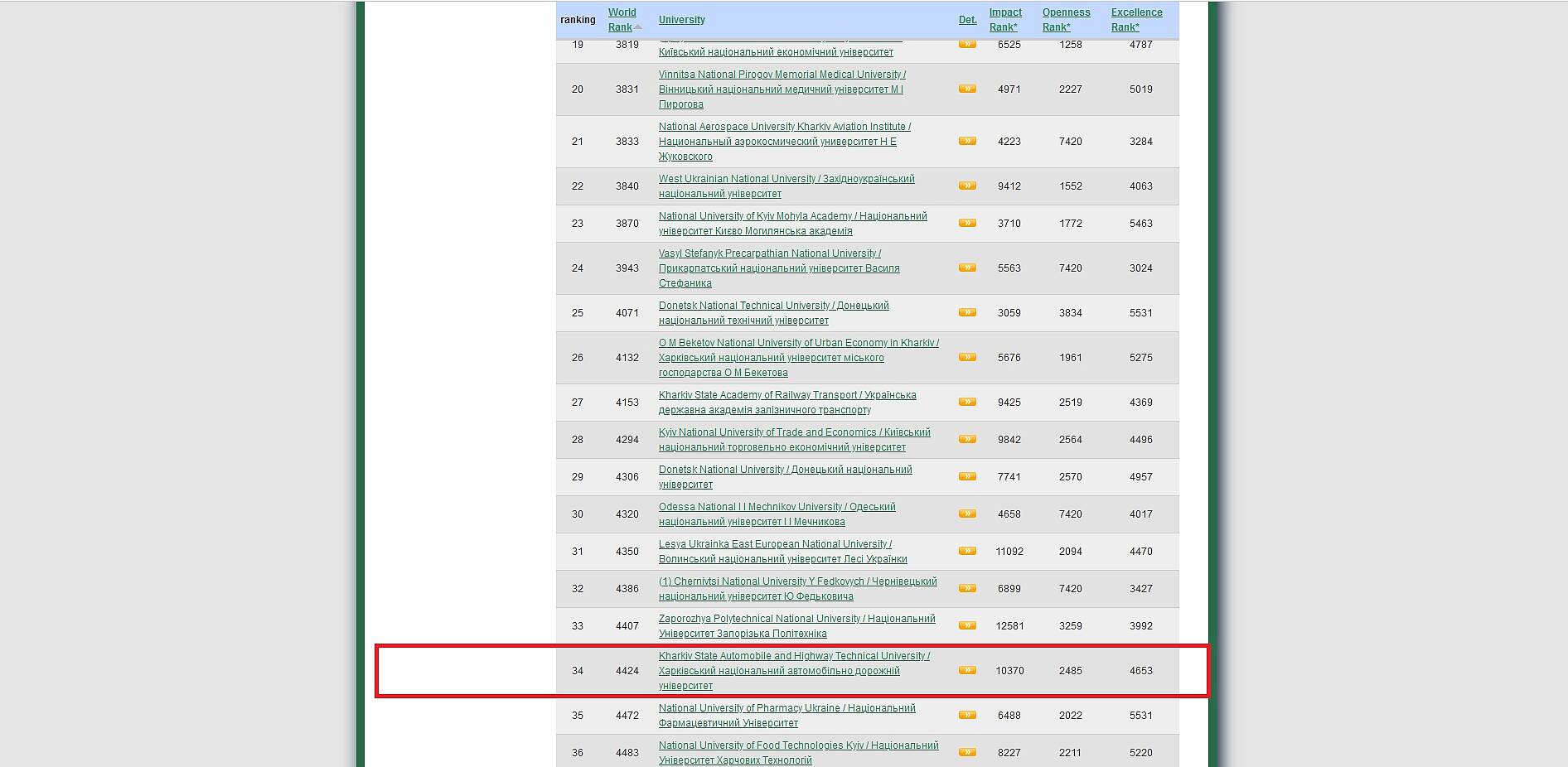 Станом на липень 2021 року наш університет займав 60 місце, за півроку ми подолали 26 позицій в світовому рейтингу. Відповідні дані показників активності університетів в інтернеті опубліковані на сайті рейтингу за станом на січень 2022 року. Всього оцінювалося більш 29 тисяч університетів світу, з них - 317 українських. Ознайомитися з повним рейтингом можна за посиланням.