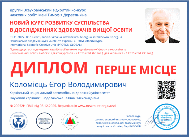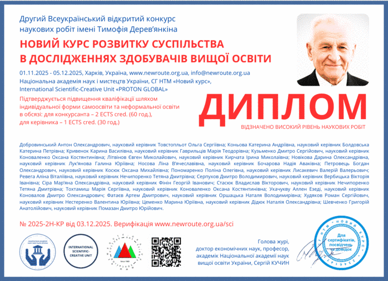 У цьому році студенти нашої кафедри знову продемонстрували сильні позиції - у фінальний шорт-лист увійшли одразу кілька робіт, а двоє здобувачів вибороли призові місця. Перше місце посів Коломієць Єгор Володимирович під керівництвом доцента Ведолажської Тетяни Олександрівни. Друге місце здобула Терьохіна Дар’я Сергіївна, яку до перемоги підготувала старший викладач Величко Яна Іванівна. Високий рівень наукового дослідження також показала Носова Ліна В’ячеславівна, чию роботу визнано однією з найкращих у шорт-листі; її науковий керівник - доцент Бочарова Надія Аваківна.