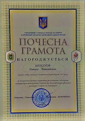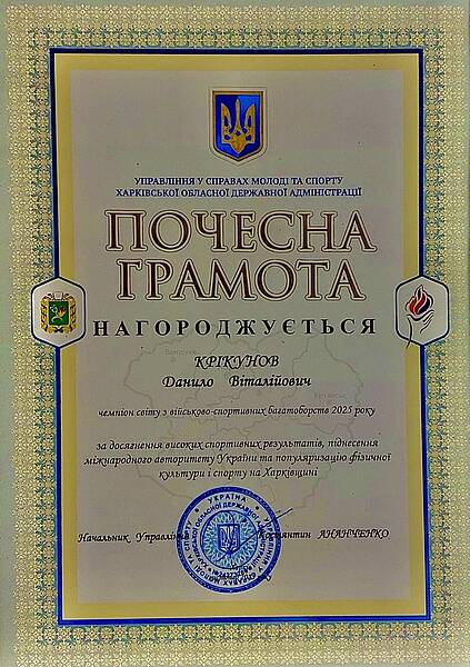 Серед нагороджених був також Крікунов Данило Віталійович, студент групи ДТ-51-25 ХНАДУ. ​Спортсмени та їхні наставники отримали Почесні Грамоти за досягнення високих спортивних результатів, піднесення міжнародного авторитету України та популяризацію фізичної культури і спорту на Харківщині.
