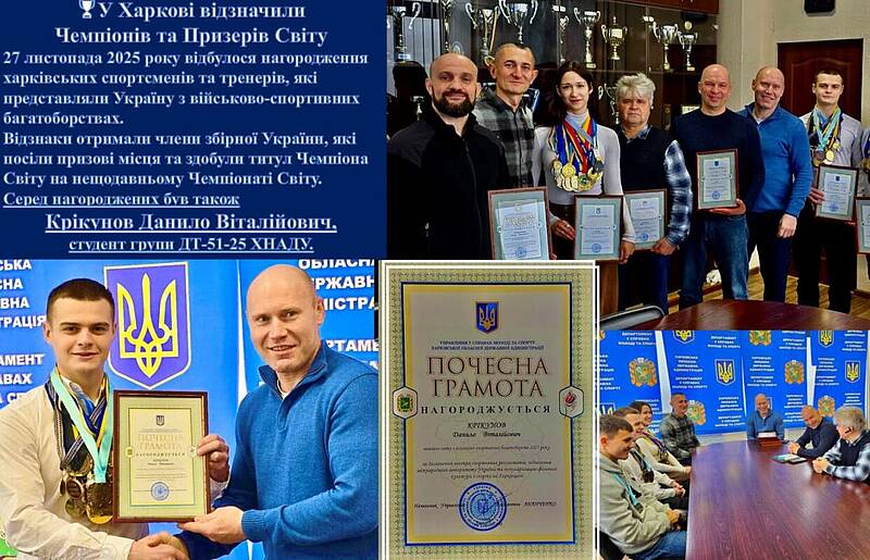 У Харкові відзначили Чемпіонів та Призерів Світу ​27 листопада 2025 року відбулося урочисте нагородження харківських спортсменів та тренерів, які представляли Україну з військово-спортивних багатоборствах. ​