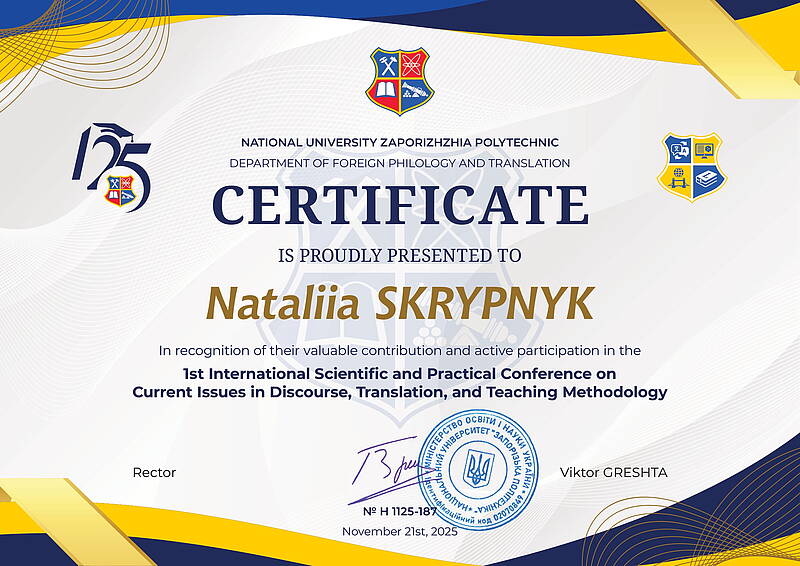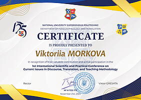 Кафедра іноземних мов заохочує своїх студентів до участі у професійно-наукових заходах. Так, студентки Даря Бєлікова та Вікторія Моркова під керівництвом доцента Наталія Скрипник взяли участь у I Міжнародній науково-практичній конференції «Актуальні проблеми дискурсології, перекладознавства та методики викладання», що відбулася 21 листопада 2025 року у Національному університеті "Запорізька політехніка", м.Запоріжжя.