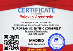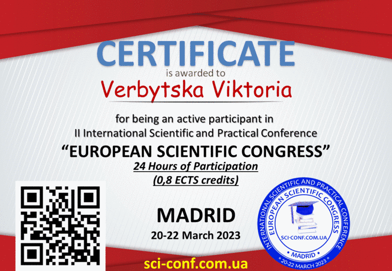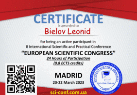 Студенти спеціальності "Облік і оподаткування" Бєлов Л.О. та Половко А.В (гр. ЕА-31) під керівництвом доцента кафедри обліку і оподаткування Вербицької В.І. взяли участь у роботі II Міжнародної науково-практичної конференції «EUROPEAN SCIENTIFIC CONGRESS» (20-22.03.2023 року. Місце проведення - Мадрид, Іспанія), куди надали доповідь на тему "Інформаційна війна".