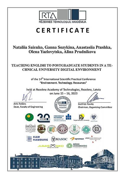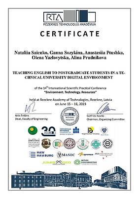 15-16 червня 2023 року в Резекненській академії технологій, Латвія, м. Резекне, викладачі кафедри іноземних мов проф. Саєнко Н.В., доц. Созикіна Г.С., доц. Птушка А.С., доц. Язловицька О.В., ст. викл. Пруднікова А.О. активно взяли участь у XIV Міжнародній науково-практичній конференції «Environment. Technology. Resources» та публікації наукової статті "Teaching English to postgraduate students in a technical university digital environment".
