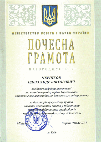 Вітаємо зав. кафедри проф. Чернікова О.В. з Почесною грамотою МОН